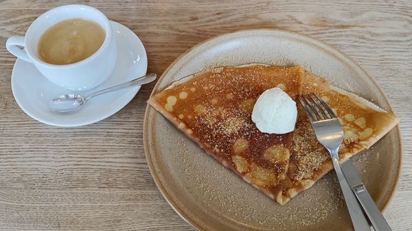 クレープ。こちらもトッピングを選択でき、砂糖とバターを。