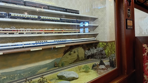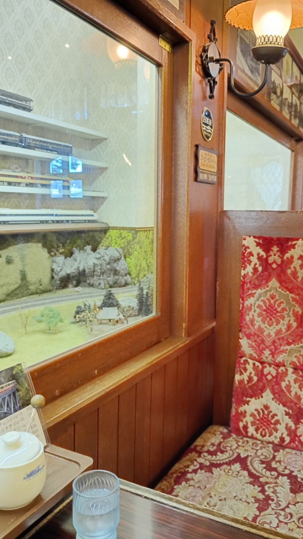 列車を模した向かい合わせのシートには、華奢な設え。まるで鉄道旅をしている気分だ。