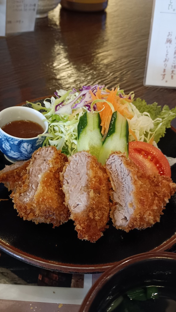 店内が薄暗く、サラダのドレッシングを勘違いして熱々のヒレカツにかけてしまった。