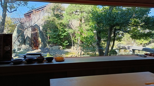 暖簾を抜けると右手に立派な日本庭園が。玄関口では着物を召したスタッフが深々とお出迎え。靴を脱ぎ、豪奢な邸宅の中を案内される。