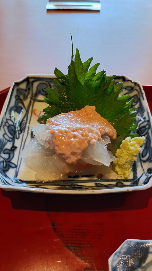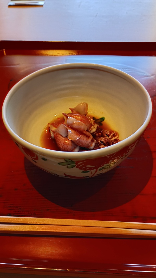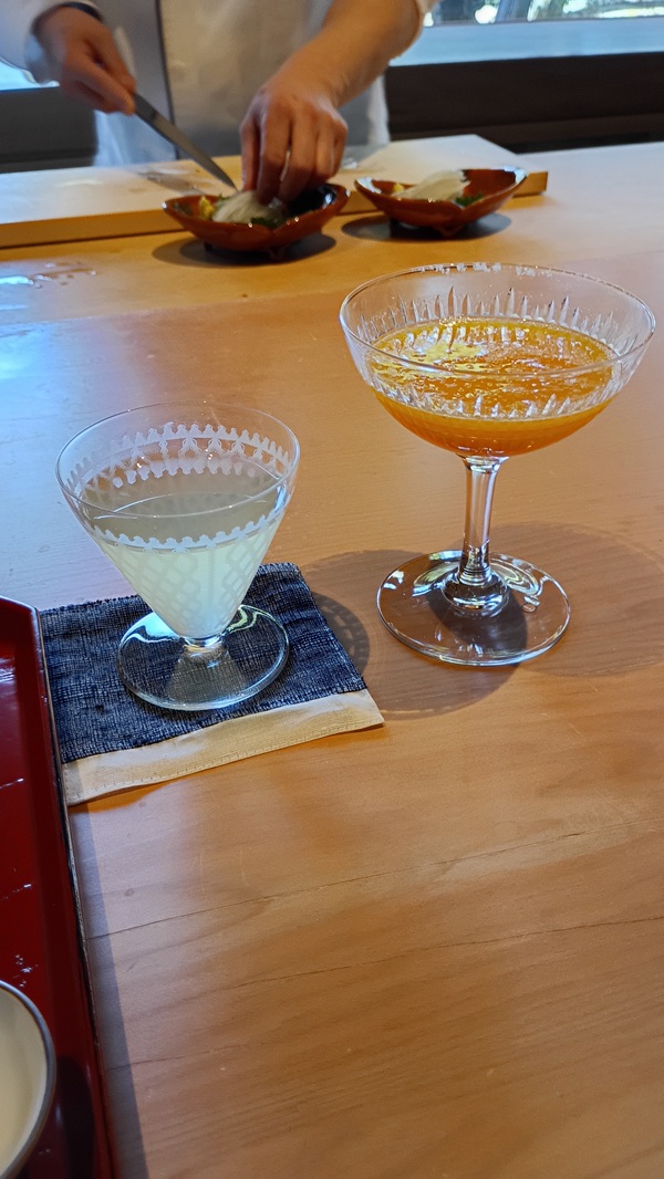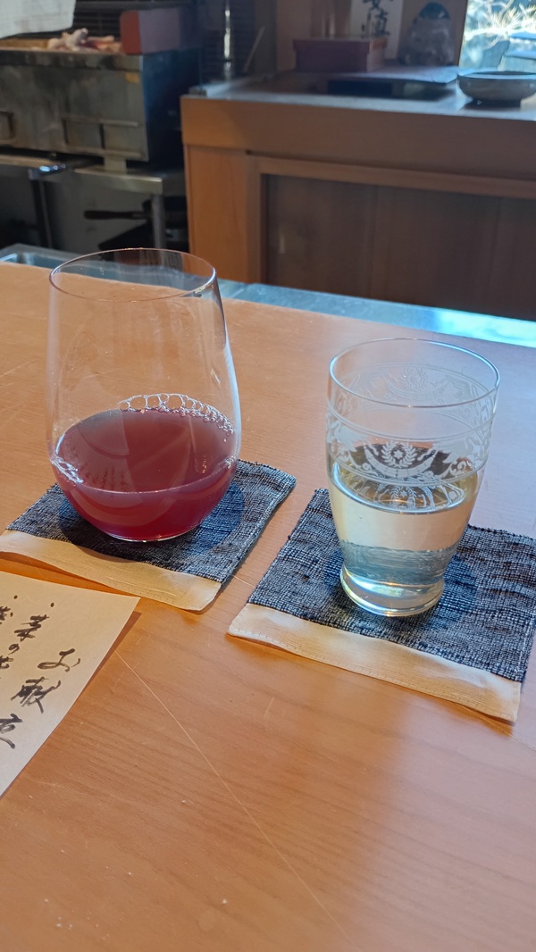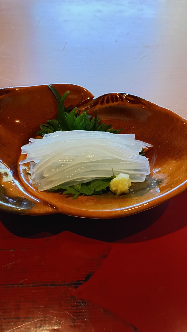 皮はぎは玄米茶、ヤリイカはみかんスパークリングで。