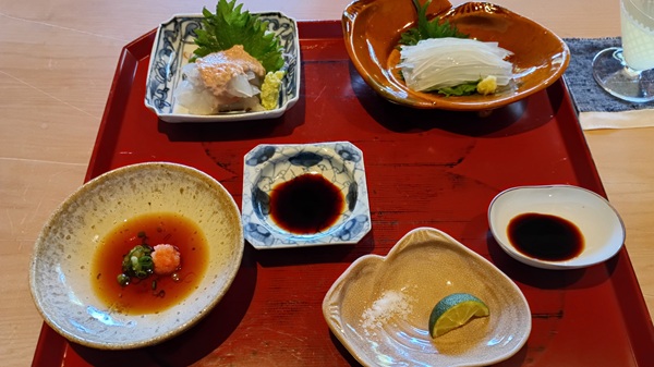 それぞれワサビ醤油、生姜醤油、ポン酢、海洋深層水の塩で。