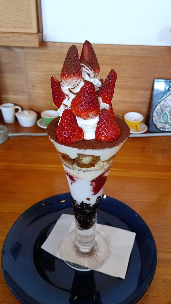 う、うーむ・・.・・・・・・・・・.美味しいパフェが食べてみたい。.というわけで、パフェとパンケーキのお店へゴー。平日の昼下がりなのでそんなに人はいないだろう。.こういう感じのお店に初めて入るのは勇気がいる。ドキドキだ。.ドアを開けると・・・.・・・・・・・・・.見事にお客さんは女性だけ。.・・・・・・・・・.小汚いのが一匹紛れ込んで、どうもすいません(笑).メニューは豊富でどれも美味しそうだ。迷...