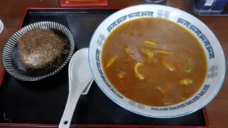 粘度の高いカレールー。肉と玉ねぎ、ボリュームのある細麺によく絡む。